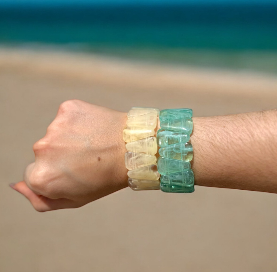 Bracelete triângulo resina disponível no branco e azul.