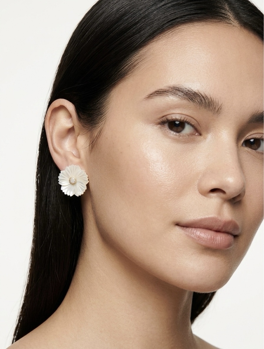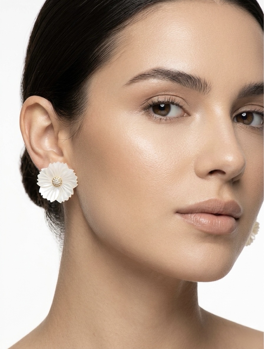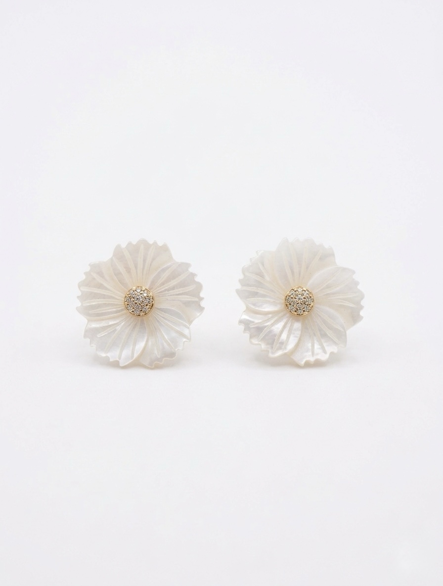 Brinco flor madrepérola M com zircônia no dourado.