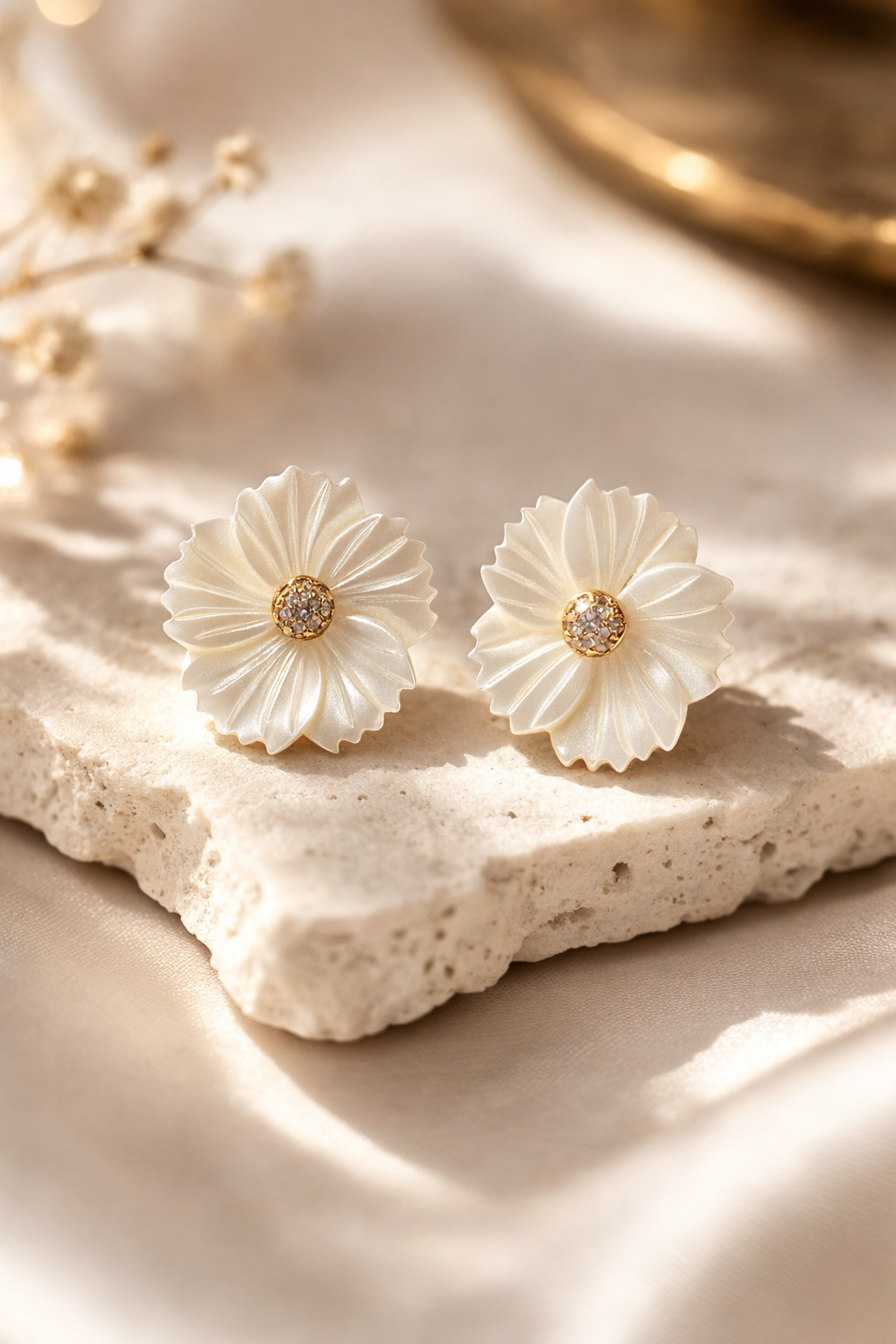 Brinco flor madrepérola M com microzircônia no dourado
