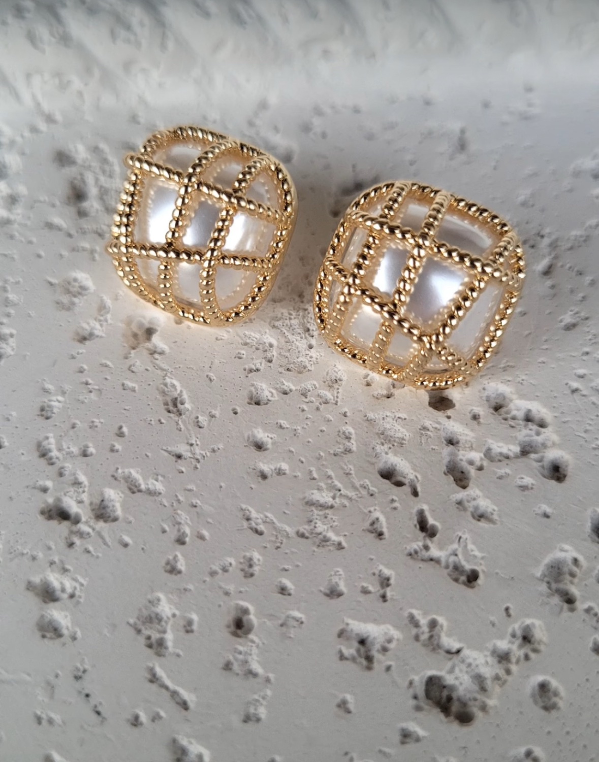 Brinco quadrado pérola hipoalergênico banhado ouro flash, ótima durabilidade.
