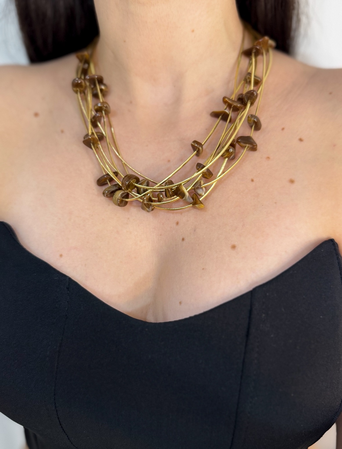 Colar cascalho de resina marrom no courinho dourado.