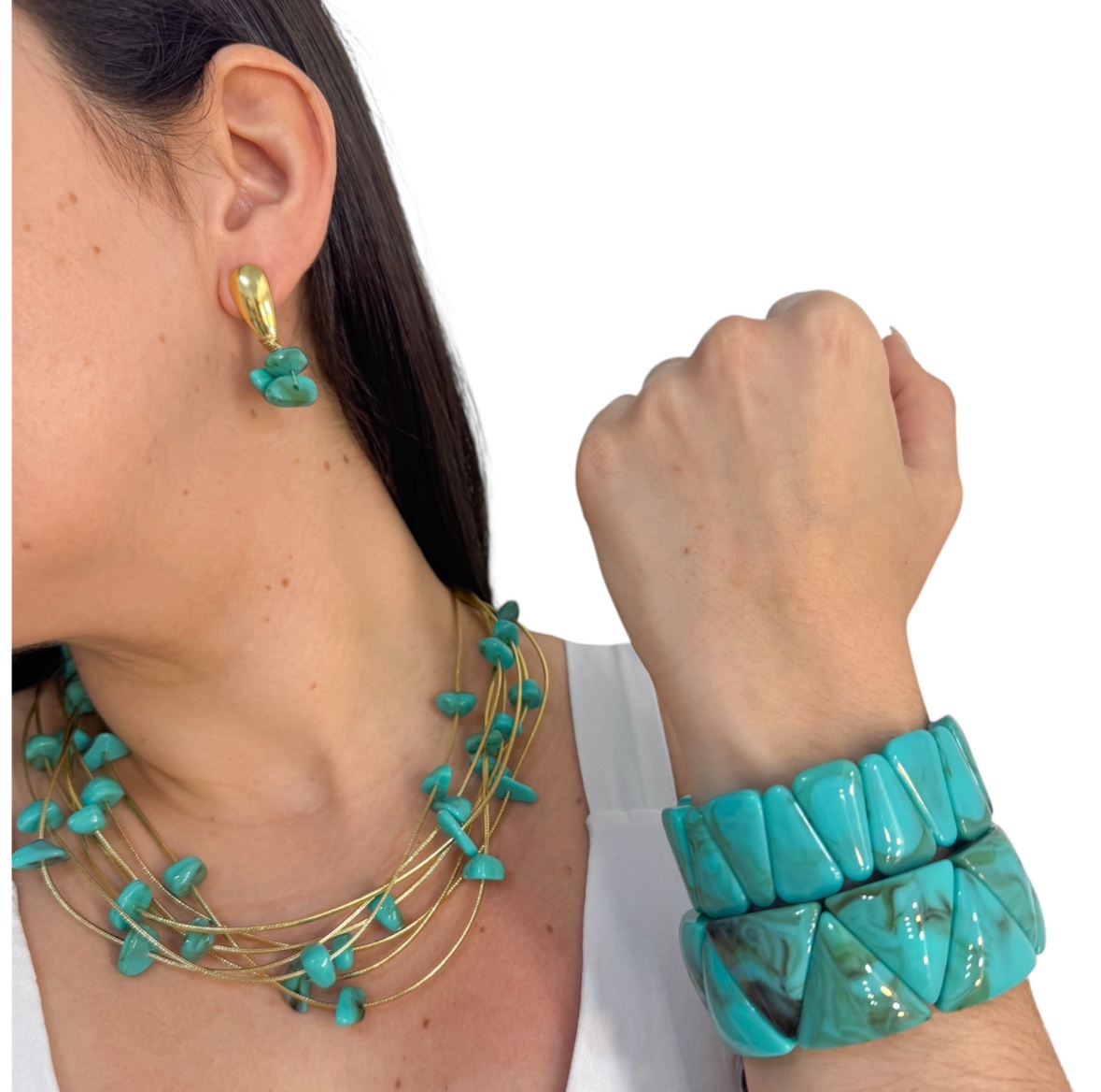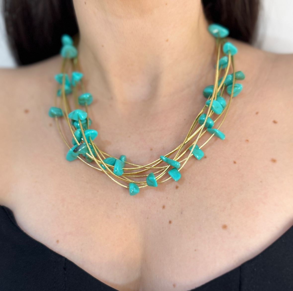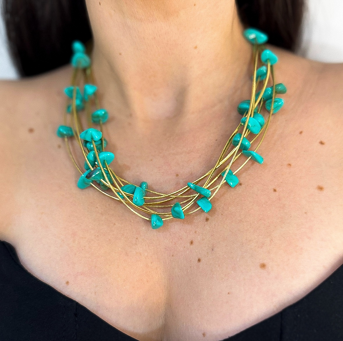 Colar cascalho turquesa na resina no fio de courinho dourado