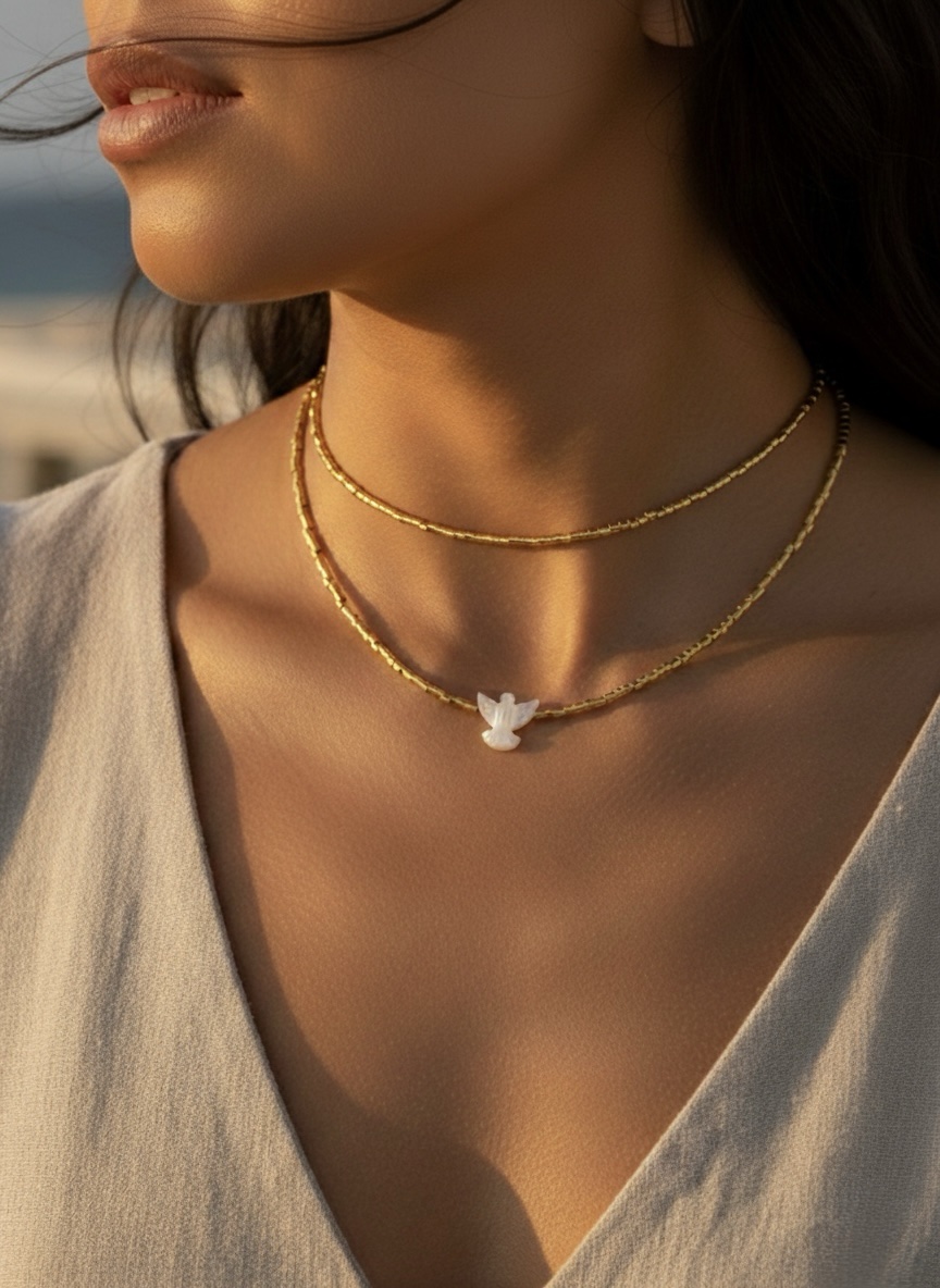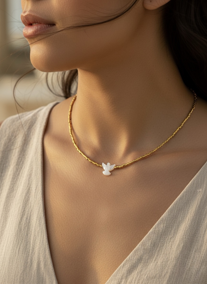 Colar Espírito Santo madrepérola com tubinhos dourado