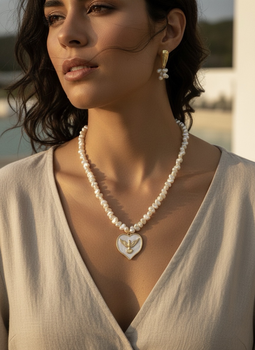 Colar espírito santo coração com pérola irregular