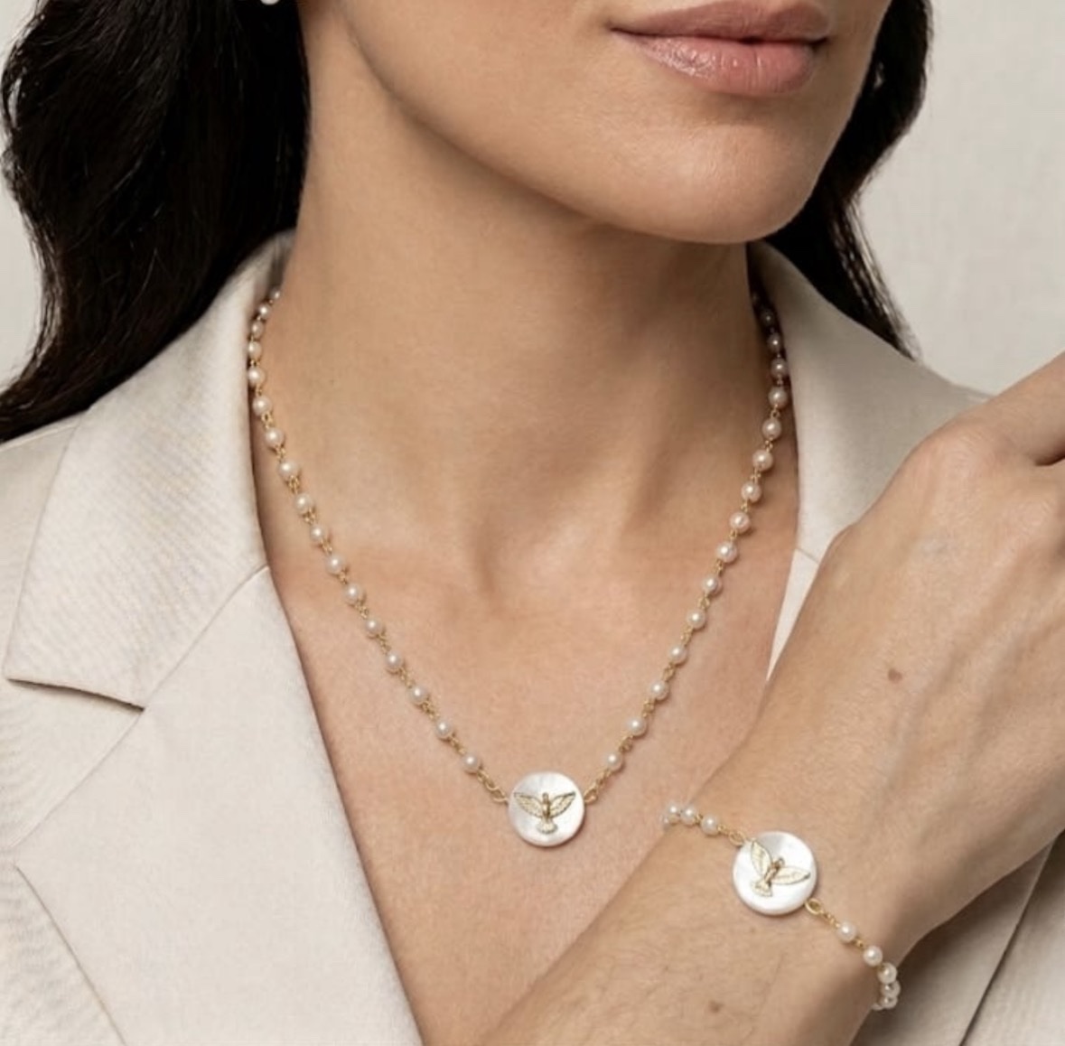 Colar corrente pérola folheada com Espírito Santo madrepérola redondo