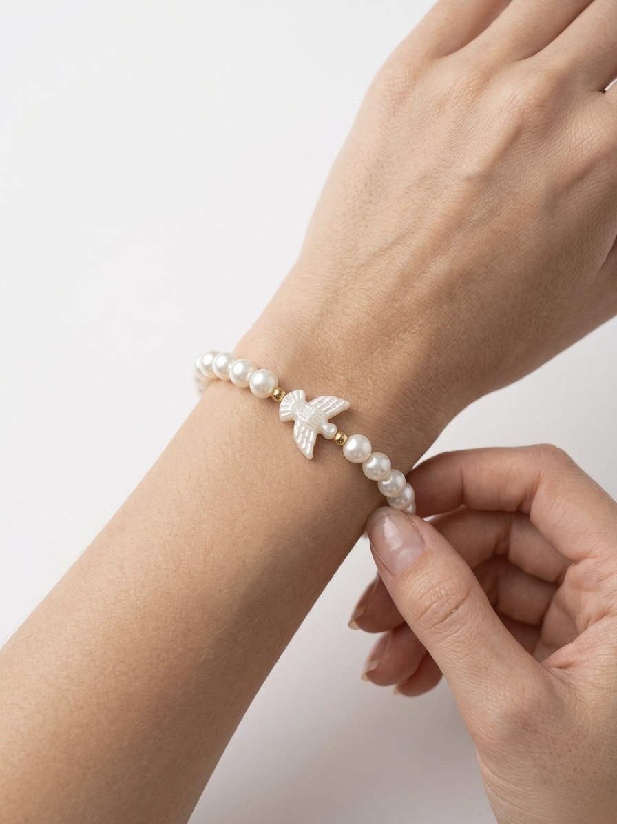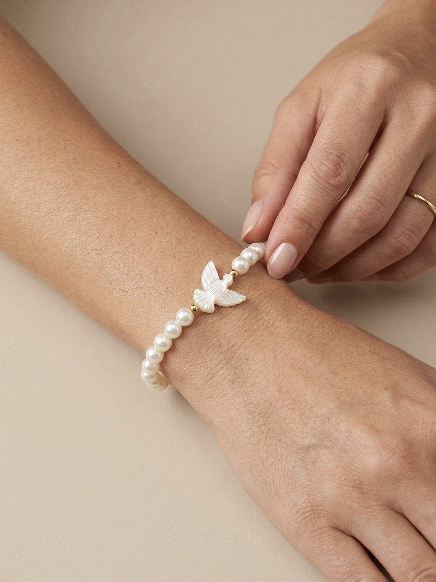 Pulseira de silicone com pérola e entremeio do Espírito Santo perola em acrílico.