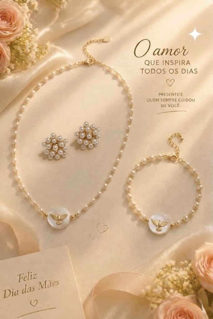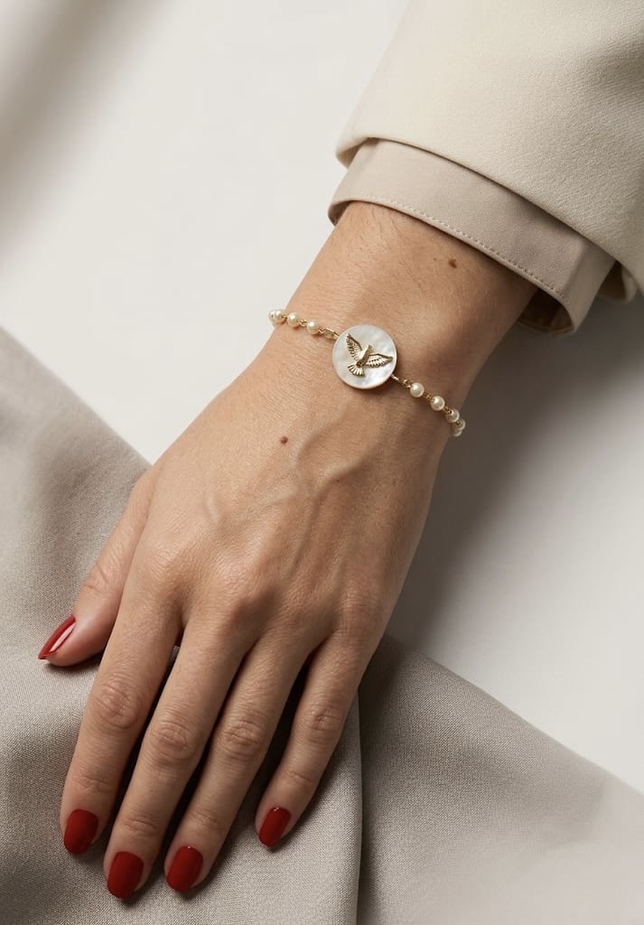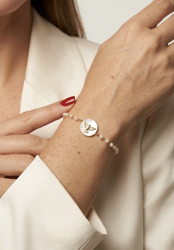 Pulseira corrente de pérola folheada com Espírito Santo madrepérola redondo